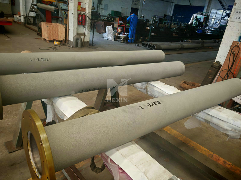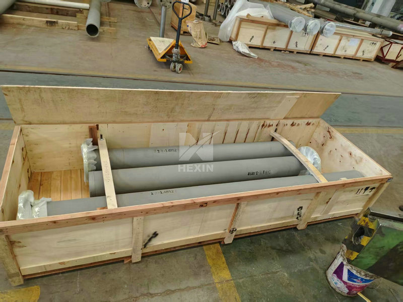The image shows a recently completed straight radiant tube, with dimensions of Φ200*2850mm/Φ200*2075mm, a weight of 129kg/97kg, and made of 1.4852 material. The radiant tube body is centrifugally cast. It has passed inspection and meets customer requirements, and has been shipped. Centrifugal casting is the main production process for radiant tubes, capable of producing radiant tubes of various diameters. We accept long-term orders for radiant tubes of different sizes; production can be based on provided drawings or custom orders.